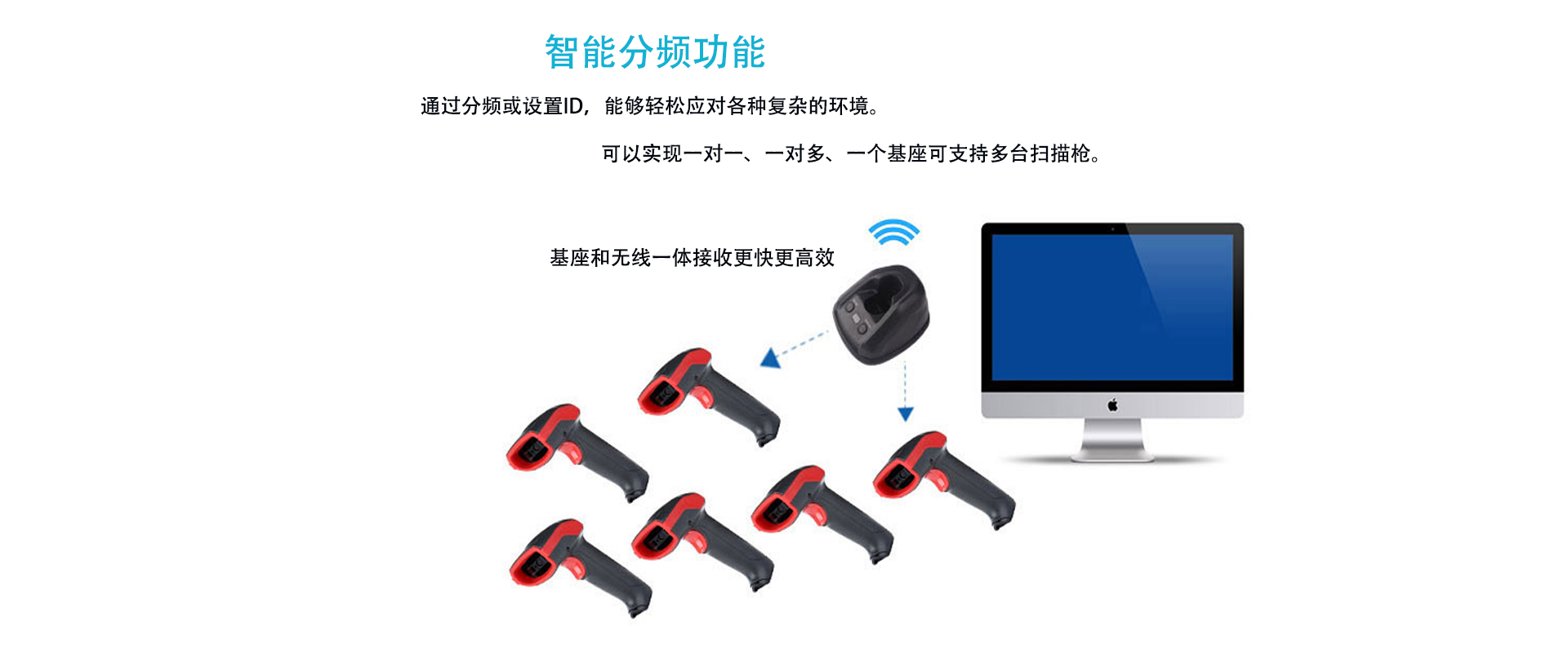 7、使用方便。基座和无线枪一键匹配。2 个双色 LED 清楚指示条码枪各种工作状态,如低电量、正在充电、正在发送数据、存储器已满等等。
