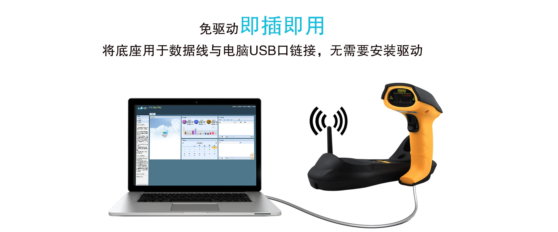 7、使用方便。基座和无线枪一键匹配。2 个双色 LED 清楚指示条码枪各种工作状态,如低电量、正在充电、正在发送数据、存储器已满等等。